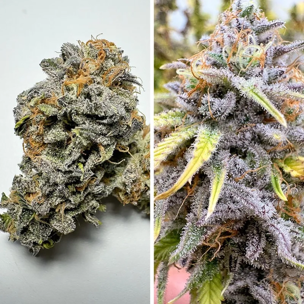 - Mimosa (Clementine x Purple Punch): Bringt das intensive, fruchtige Zitrus-Terpenprofil, die lebendige Wirkung und eine ausgeprägte Harzproduktion in die Genetik ein.