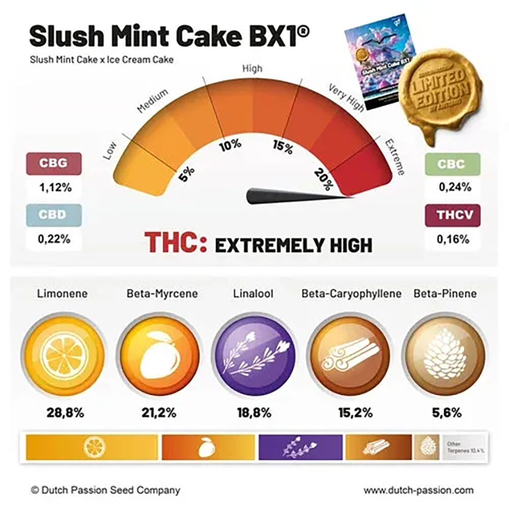 Slush Mint Cake BX1® Regular ist eine limitierte Züchter-Edition von Dutch Passion x Antonio – eine Indica-dominante Hybride mit bis zu 28% THC, steinharten trichombedeckten Blüten und einem preisgekrönten Geschmacksprofil aus süßen Fruchtbonbons, Benzin und cremigem Eis. Für erfahrene Züchter und Connaisseure.