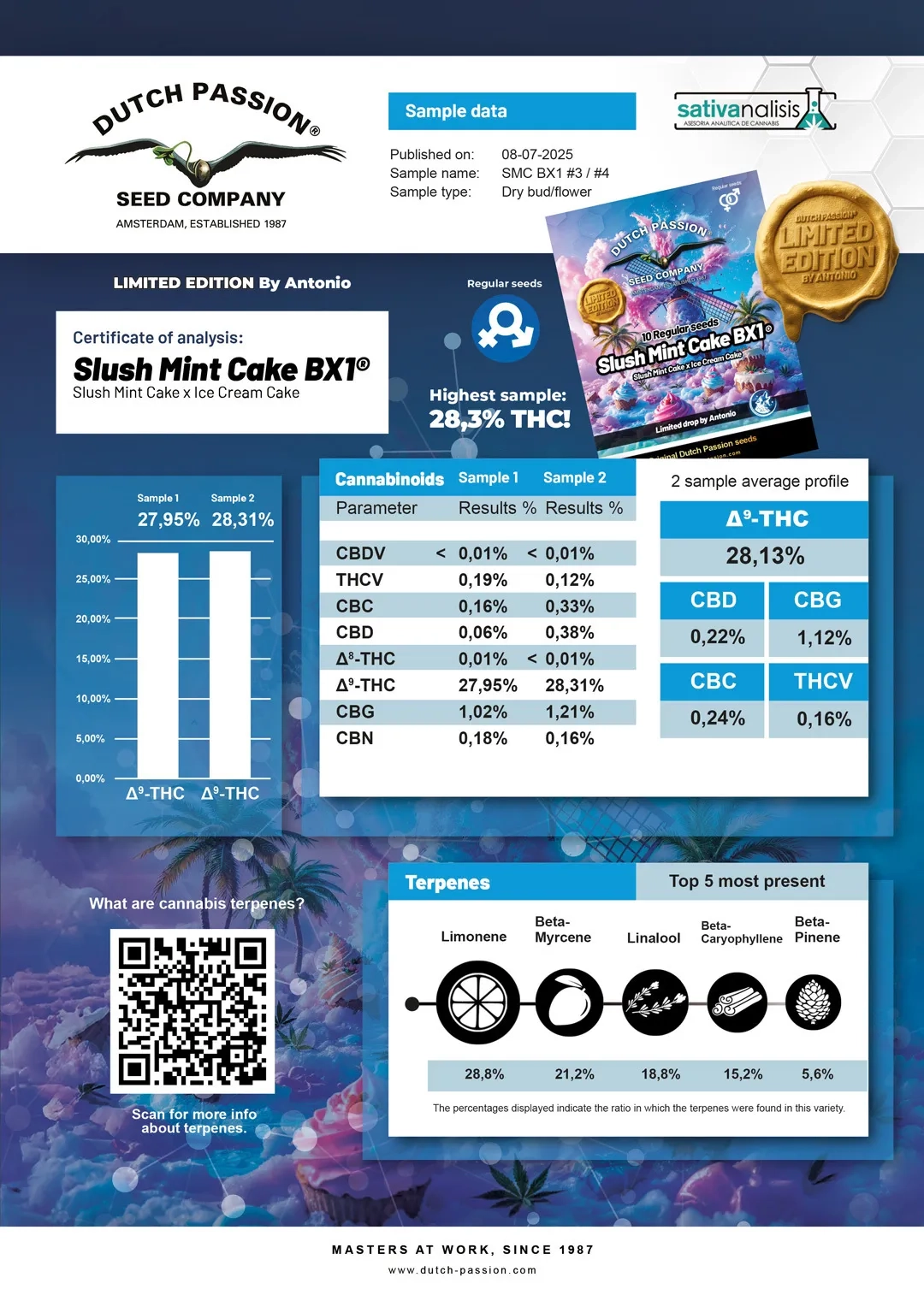 Die originale Slush Mint Cake® ist eine feminisierte Sorte, die von Antonio (In House Genetics Slurmint x Ice Cream Cake) entwickelt wurde und bereits mehrfach auf Cannabis Cups ausgezeichnet wurde, unter anderem beim Highlife Cup 2025. Die BX1-Version ist eine Rückkreuzung dieser Sorte mit dem männlichen Ice Cream Cake Elternteil. Diese Rückkreuzung produziert reguläre Samen (männlich und weiblich) und steigert die Potenz nachweislich noch weiter – bis zu 28% Delta-9-THC wurden in unabhängigen Labortests gemessen, ein noch höherer Wert als bei der feminisierten Originalversion.