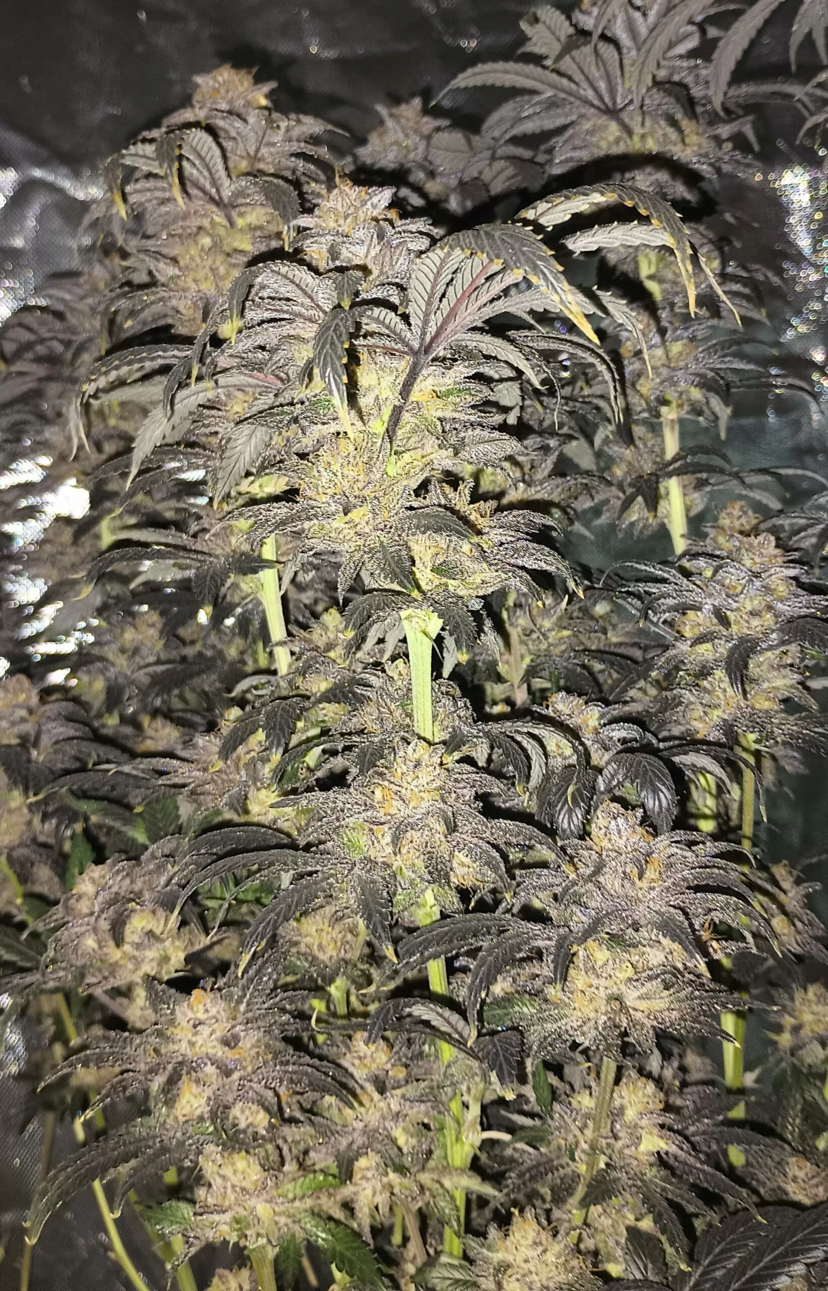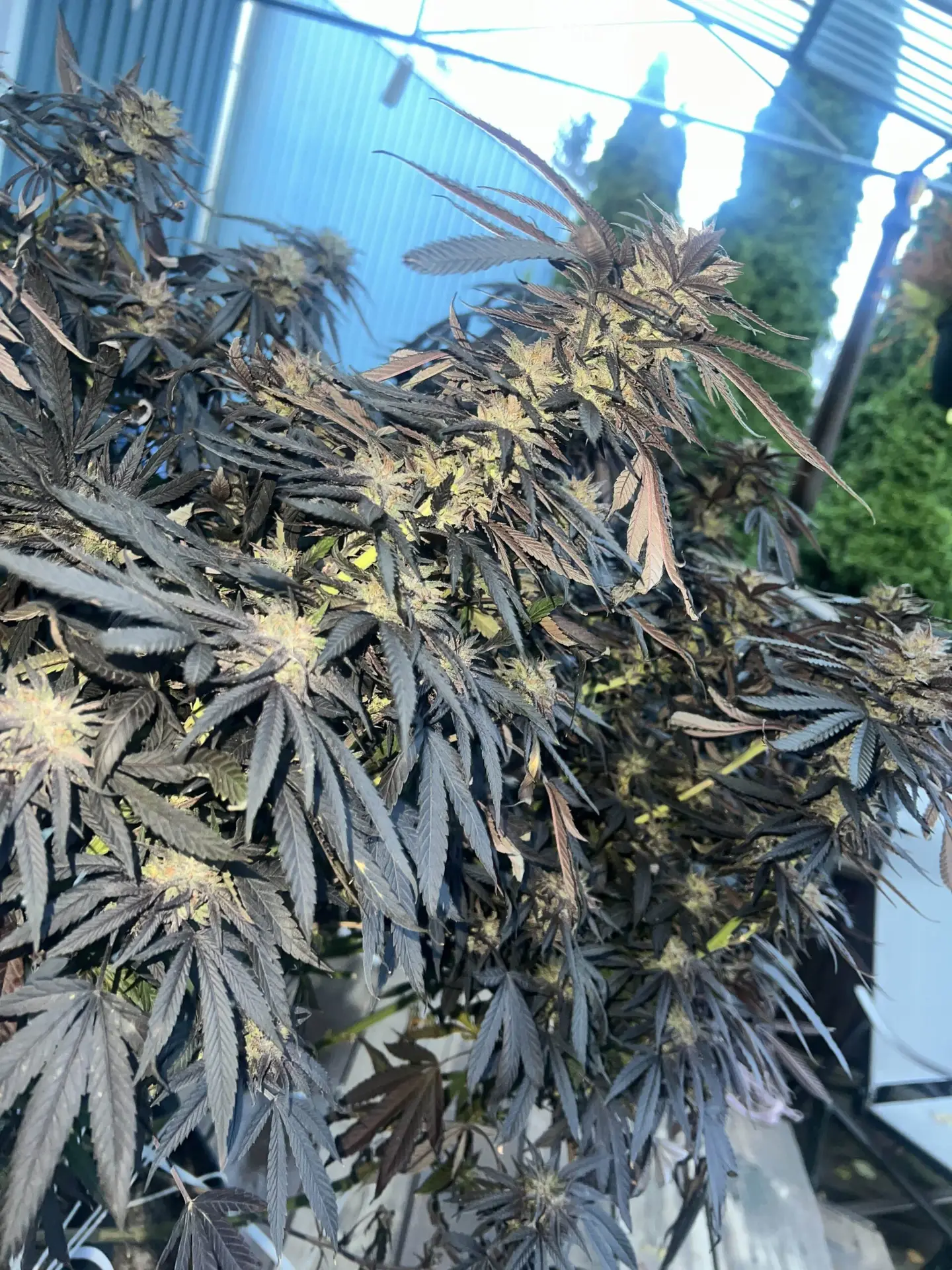 Violetti entwickelt beim Übergang zur Blüte einen 1,5- bis 2-fachen Stretch, der bei der Raumplanung berücksichtigt werden sollte. Besonders empfehlenswert ist Supercropping statt traditionellem Topping: Die Sorte reagiert auf diese schonende Trainingsmethode deutlich besser und belohnt mit einer Fülle von Colas, die mit charakteristischen rosenknopf-förmigen Blüten besetzt sind – ein visuell absolut einzigartiger Anblick. Die Farbentwicklung ist eine der spektakulärsten im gesamten Umami-Sortiment: Tiefviolette, orange, elektrisch gelbe und blaue Töne treten häufig gleichzeitig an einer Pflanze auf, besonders in der Spätblüte bei abgesenkten Nachttemperaturen. Violetti zeigt moderate Schimmel- und Mehltauresistenz und ist besonders für kältere Klimazonen geeignet – dokumentierte Phänotypen haben Nachtfröste bis -9°C überlebt, was sie zu einer der winterhärtesten modernen Cannabis-Genetiken macht. Outdoor-Grower in gemäßigten oder nördlichen Klimazonen profitieren besonders von dieser Robustheit.