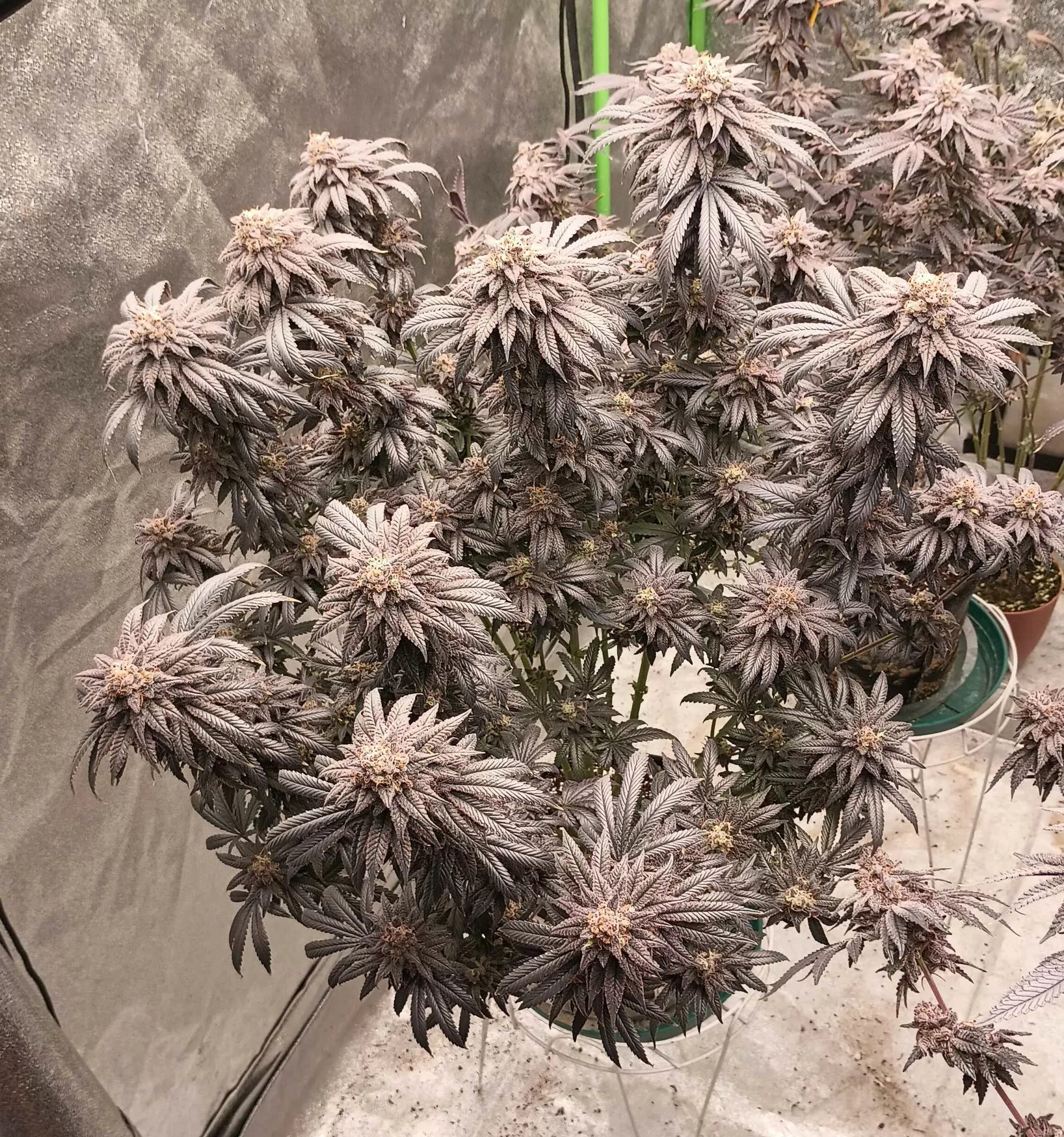 Violetti reagiert auf das sanfte Knicken und Biegen der Äste beim Supercropping deutlich besser als auf klassisches Topping. Diese Technik fördert die laterale Verzweigung ohne den Wachstumspunkt zu entfernen, was bei Violetti zu einer besonders hohen Anzahl gleichmäßig bestückter Colas mit den charakteristischen rosenknopf-förmigen Blüten führt. Das Ergebnis ist ein üppiger, gleichmäßiger Canopy mit maximalem Ertragspotenzial.