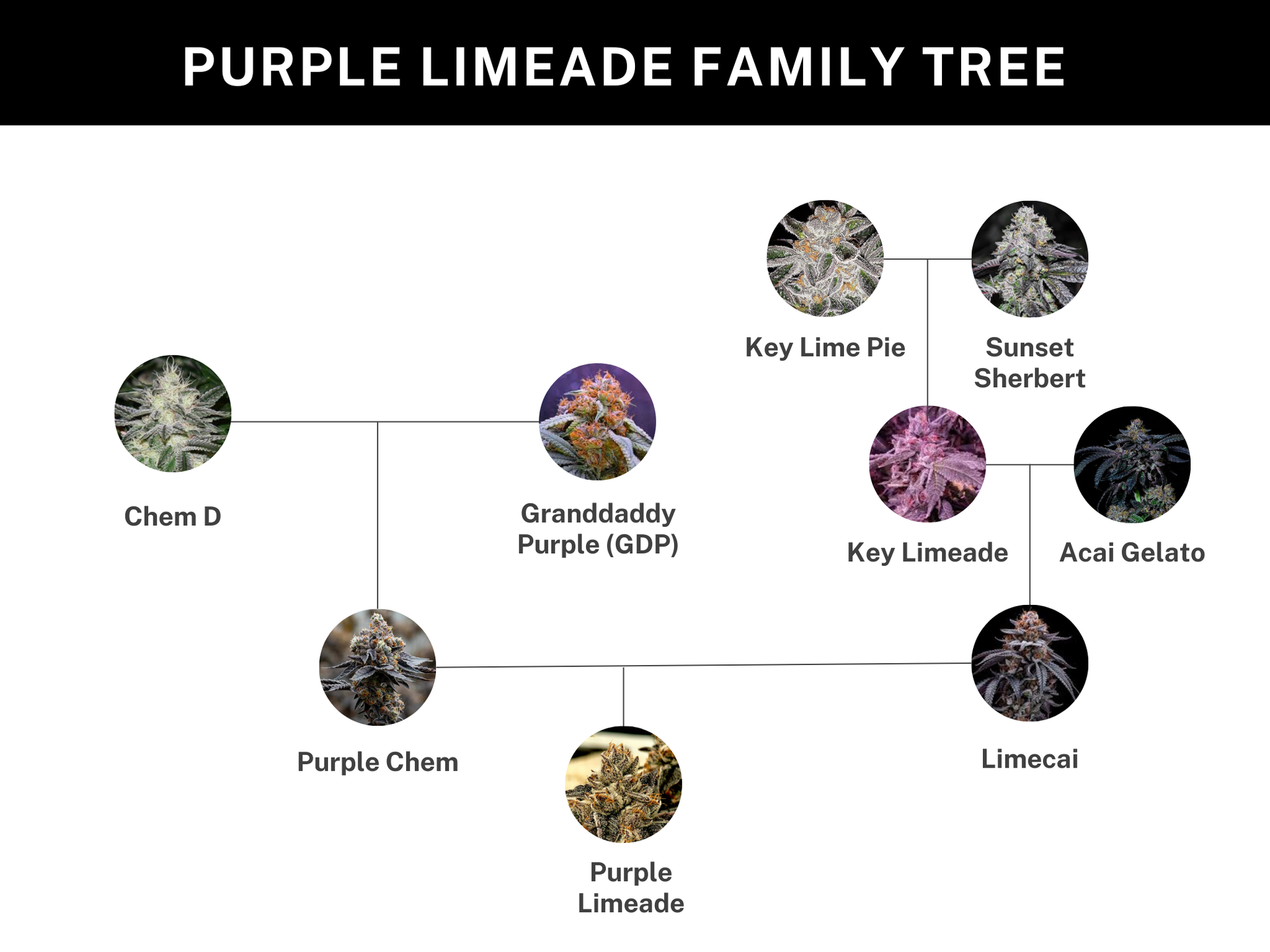 - Chem D: Eine der einflussreichsten Chemdog-Linien überhaupt – verantwortlich für das würzig-chemische Rückgrat, die hohe Potenz und den typischen Fuel-Unterton, der Purple Limeade Tiefe und Komplexität verleiht.